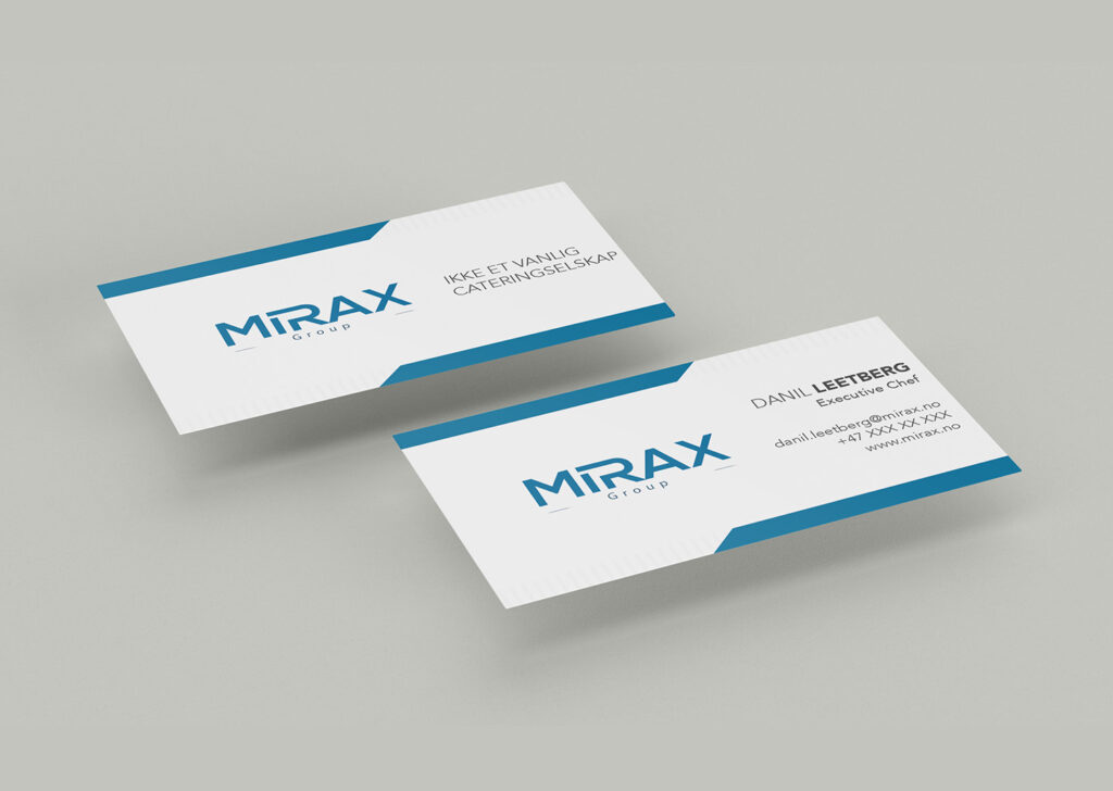Strategic use of space and colour highlights the essential details, making the card not just informative, but also a memorable visual marker of the company’s identity. The inclusion of the tagline “Ikke En Vanlig Cateringselskap” positions Mirax as a unique player in the catering industry, one that prides itself on standing out in the market.